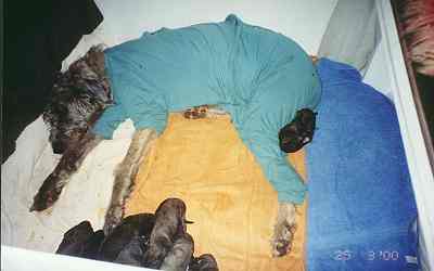 Amaryllis legt offensichtlich Wert auf Tradition und hat wohl beschlossen, das Geschäft der Nahrungsbeschaffung für ihre Kinder dauerhaft vollinhaltlich auf mich zu übertragen. Die Hoffnung, dass sich ihre Gesäugeentzündung legen wird, habe ich endgültig begraben - d.h., es wird besser, wenn ihre Kinder nicht bei ihr trinken, sobald aber die Milchproduktion wieder angeregt wird durch die gesteigerte Nachfrage der Welpen, beginnt bereits kurze Zeit später mein segensreiches ph-Papier Alarm zu signalisieren. Alsdann : Füge ich mich also in mein Schicksal ! Wenn sie auch nicht für die Ernährung verantwortlich zeichnet - aber bei ihren Kindern liegen und sie umsorgen, das will Amaryllis auf jeden Fall. Und es ist ein mühsames Geschäft, denn ich muss zuerst Amaryllis in ihren "Ganzkörper-Raumanzug" (Marke Eigenbau - gebastelt aus zwei langarmigen T-Shirts von mir) verpacken - denn die Kids würden sich natürlich sofort auf die Tankstelle stürzen.... Und wenn Amaryllis mal raus muss (und was heisst hier "mal"), dann muss sie wieder aus der Verpackung geschält werden und danach wieder hinein usw.usw. |